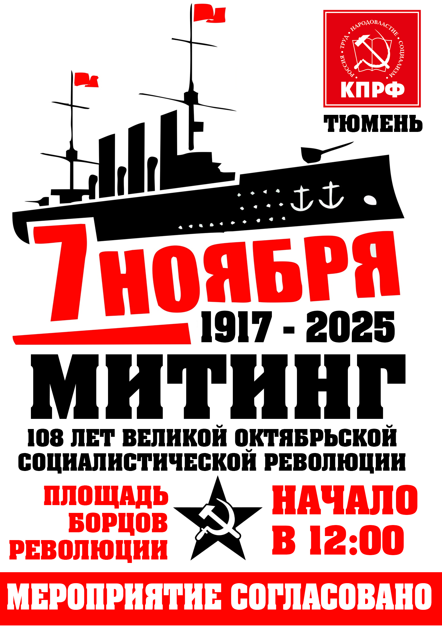 7 ноября 2025 года, в День 108-ой годовщины Великой Октябрьской социалистической революции, Тюменское областное отделение КПРФ приглашает на патриотическое мероприятие, посвящённое этой памятной дате!