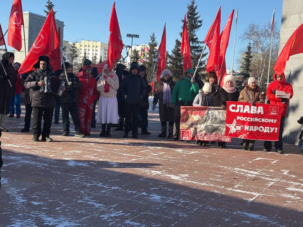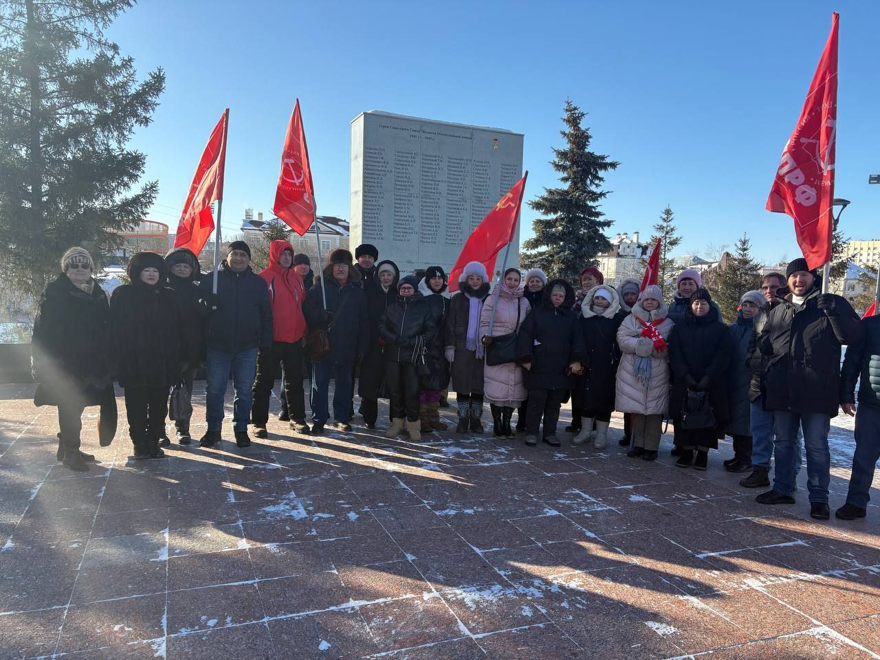 После информационной части и традиционного чаепития коммуниcты не ограничились стенами обкома. Активисты отделения влились в строй Центрального райкома и приняли участие в торжественном митинге на исторической площади у Вечного Огня. Участники митинга почтили память павших героев, защитников Отечества, возложив цветы к мемориалу.