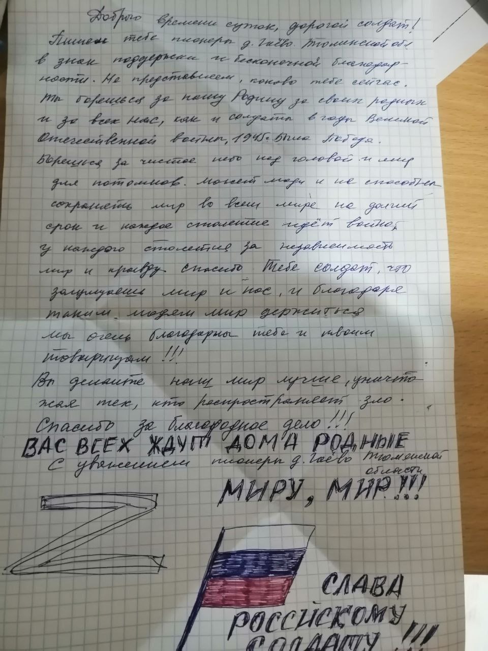 В селе Исетское под руководством старшей пионервожатой Надежды Ивановой кипела живая и полезная работа. С помощью активисток ВЖС Ольги Гляденовой и Фарузы Рафиковой, а также коммуниста Александра Иванова, пионеры учились ходить строем под бой барабана и звуки горна, осваивая азы организованности и дисциплины. А после строевой подготовки все вместе ребята писали теплые, искренние письма-треугольники солдатам, участвующим в специальной военной операции, чтобы поддержать их и выразить свою благодарность.
