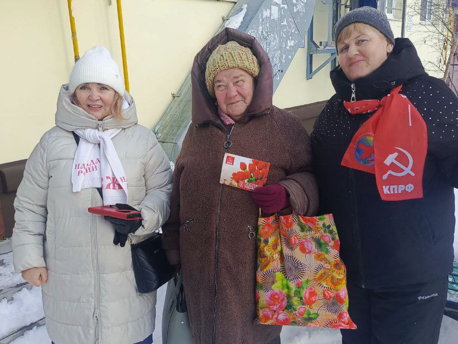 Затем активисты вышли поздравлять женщин на улицу. Женщинам вручали поздравительные открытки КПРФ.