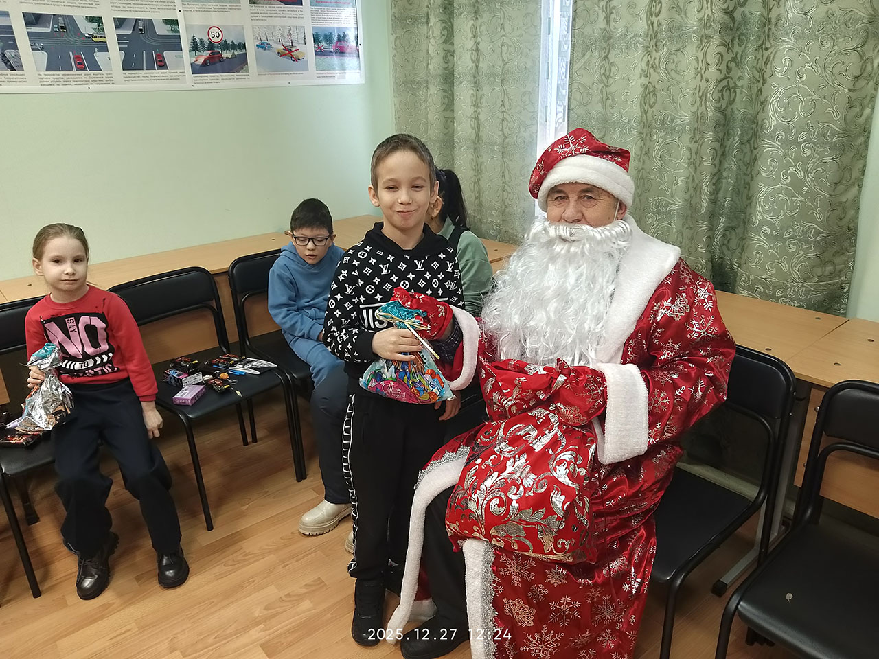 Первый секретарь горкома Наталья Александрова поздравила детей с наступающим новым годом и пожелала крепкого здоровья и счастливого детства, добавив, что городское отделение партии охотно выделило средства для приобретения подарков и призов.