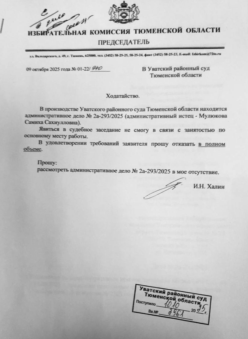 О своём отказе участвовать в иске руководитель Избирательной комиссии Тюменской области в письменной форме уведомил Уватский район суд. Ссылаясь на занятость по основному месту работы, Халин попросил рассмотреть дело в его отсутствие. Чем занят председатель облизбиркома в период между выборами и почему нельзя направить представителя по доверенности, в письме не сообщается. Ранее суд привлёк облизбирком к иску в качестве заинтересованного лица.