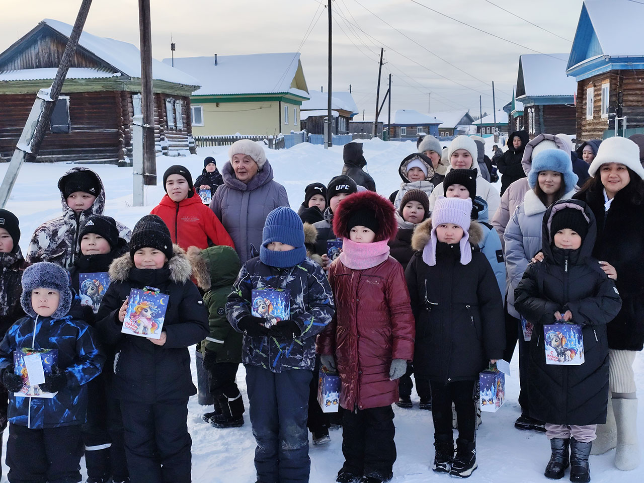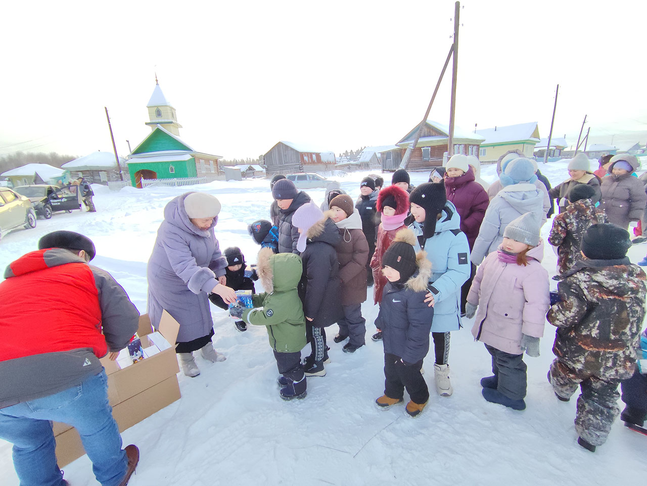 Наша команда в хорошем настроении поехала в село Ачиры. По пути мы не ожидали встретить на улице толпу детей и взрослых, которые ждали новогодние подарки. По списку было 13 детей, но мы вручили им 40 новогодних подарков. В ответ в знак внимания нам подарили кедровые шишки.