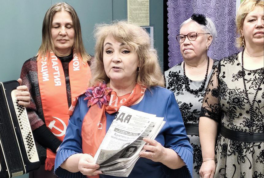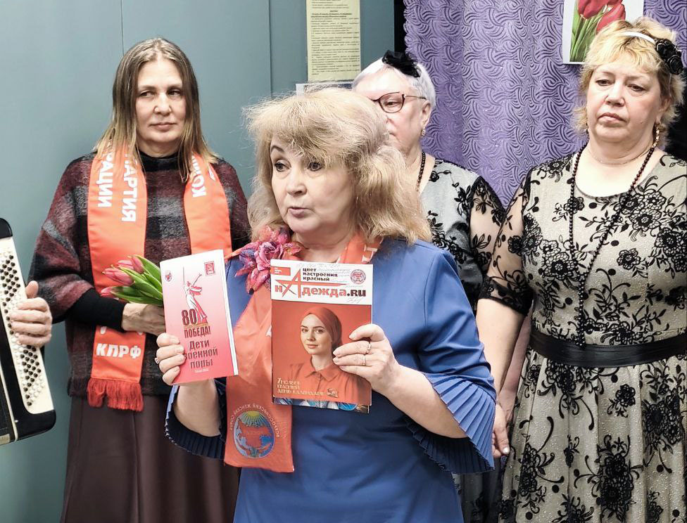 Тёплая встреча продолжилась вручением весенних тюльпанов и праздничных открыток. Активисты также презентовали собравшимся журнал «Надежды России» и номер газеты «Правда», в котором вышла статья о нашем талантливом гармонисте - коммунисте Корепанове А.А.